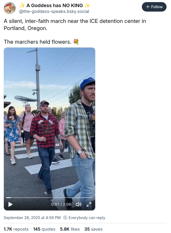 Residents of Portland pointed out that Trump's characterization of the city as "war-torn" were ridiculous and and quipped that resident were desperately bartering for heirloom tomatoes at farmers markets on a sunny weekend day in the City of Roses. Meanwhile, hundreds of peaceful protesters carried flowers, banged on buckets and called for the end to Trump's cruel crackdown on immigrants and for abolishing ICE.
